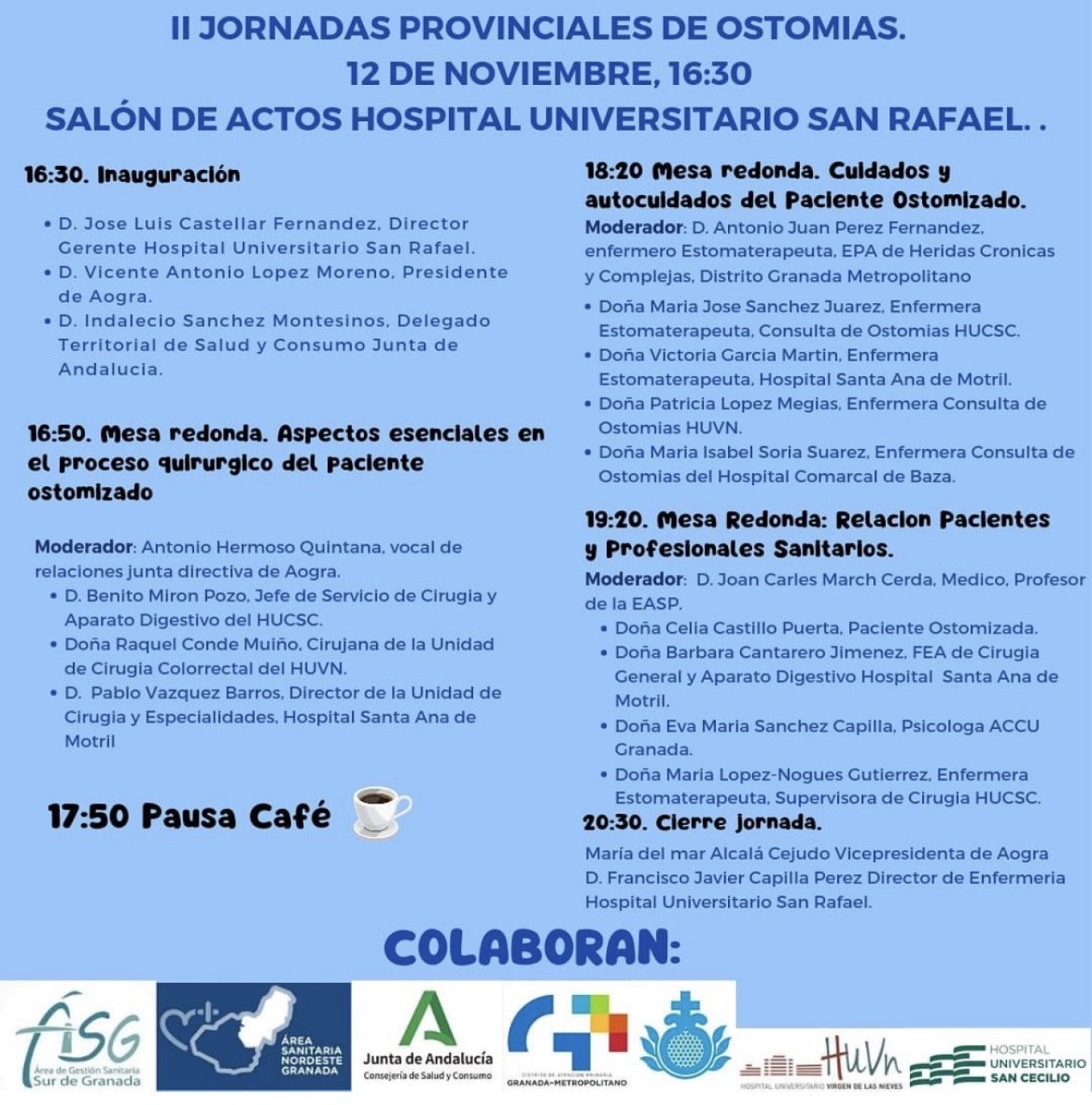 Las jornadas contaron con la colaboración de distintos centros sanitarios y entidades de la provincia de Granada, como el Hospital Universitario San Rafael, el Hospital Universitario Clínico San Cecilio, el Hospital Universitario Virgen de las Nieves, el Hospital Santa Ana de Motril, el Hospital Comarcal de Baza y el Distrito Sanitario Granada Metropolitano.